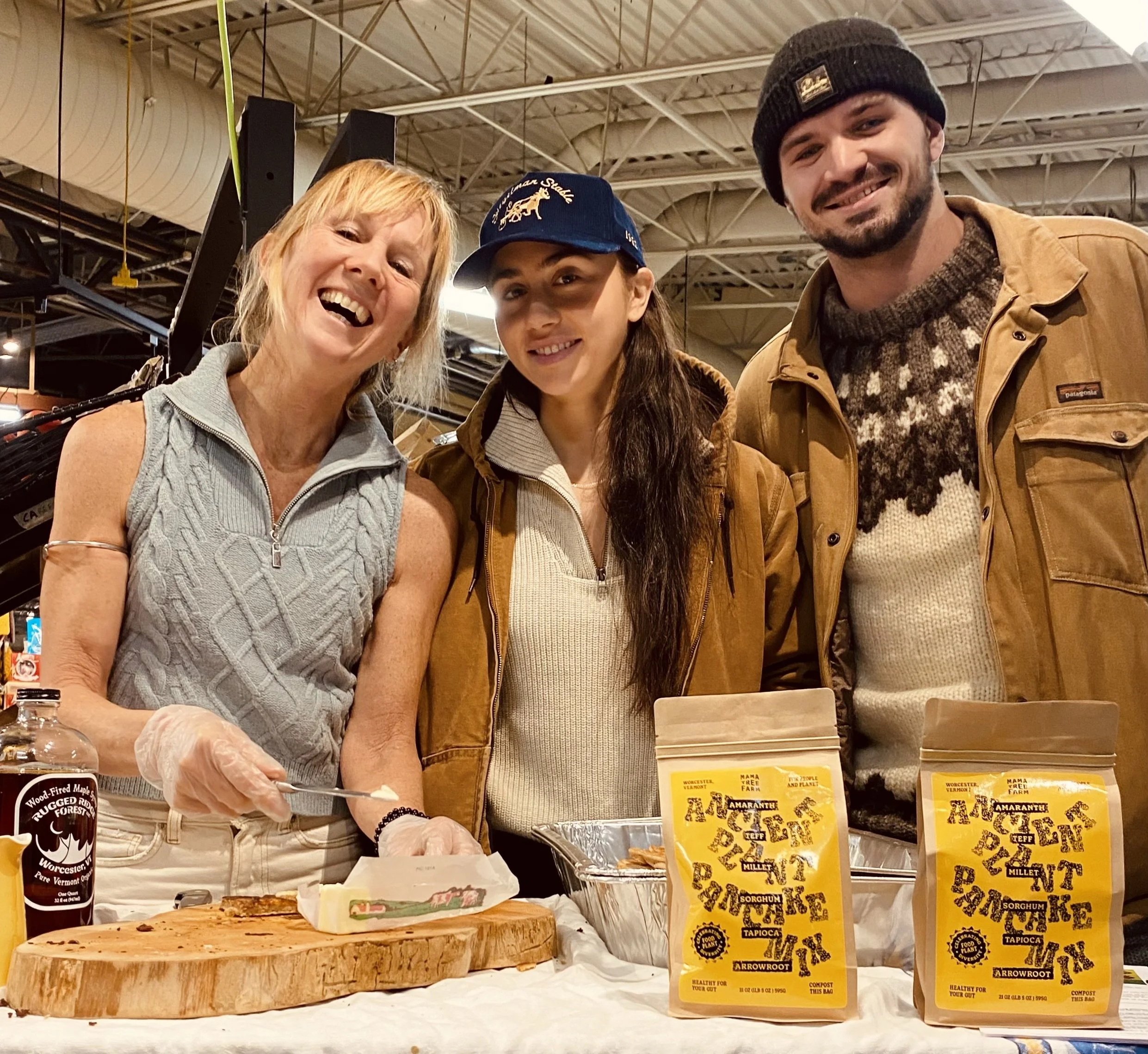 Three people smiling at a food stall with mama tree farm baking mixes, in a market or indoor event setting.