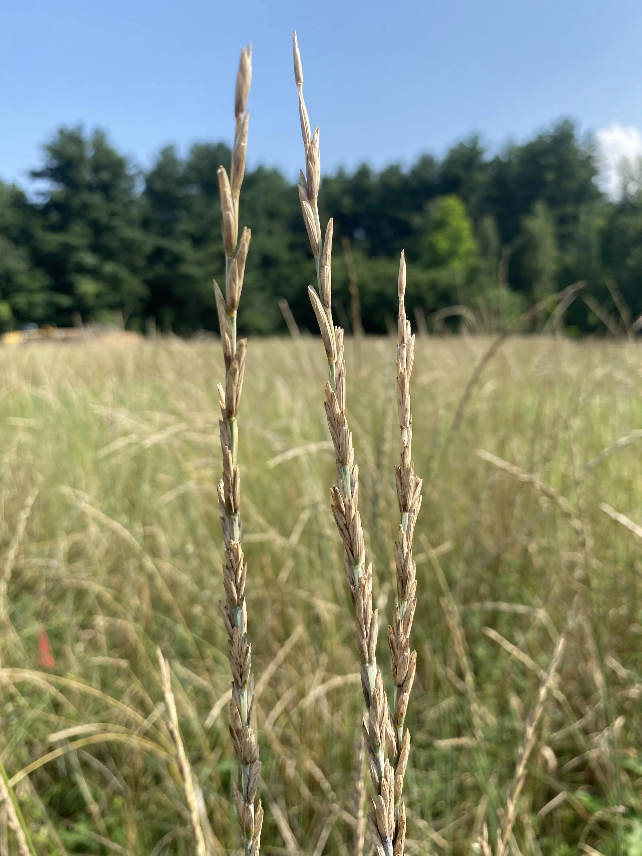 Close-up of tall grasses with seed heads in a field, with trees and a blue sky in the background.