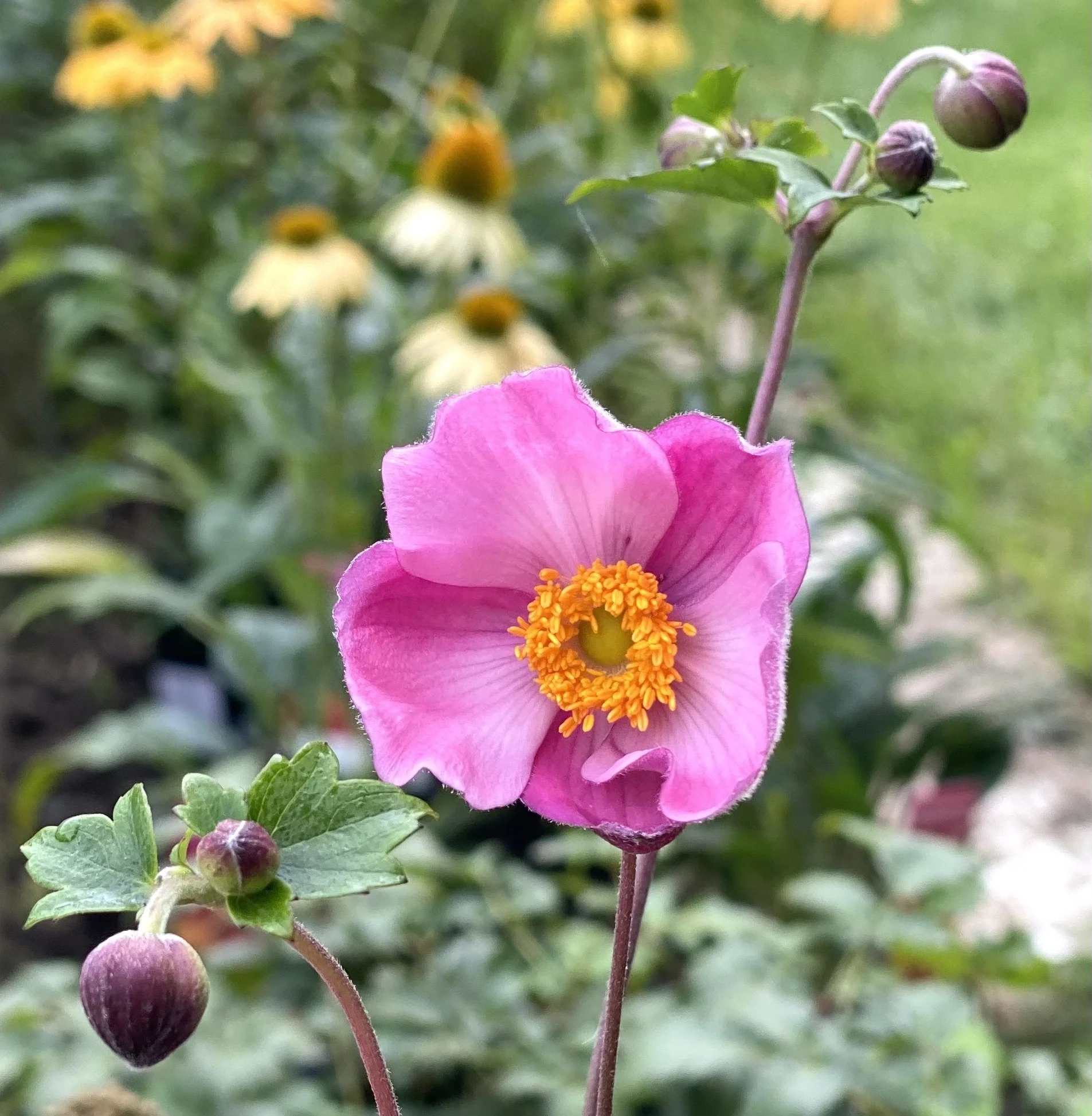 Close-up of a blooming pink and white flower in a field of green grass and other pink flowers.